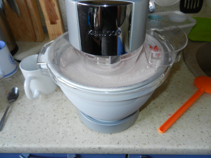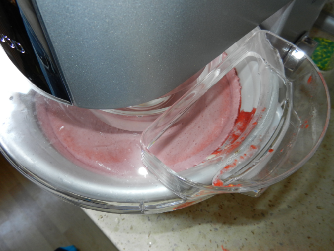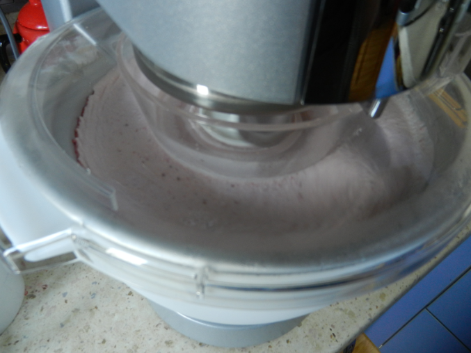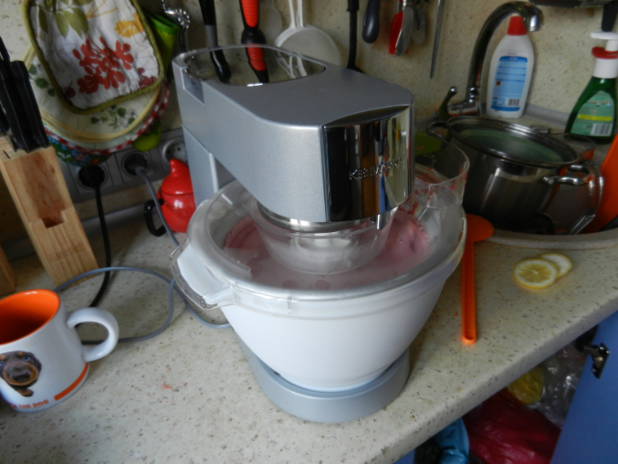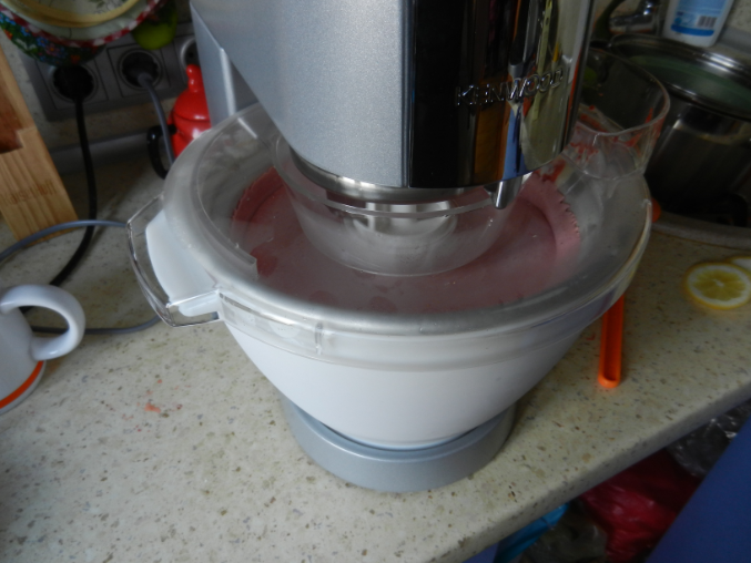 После смешания всех ингредиентов (яично-сахарная смесь + сливки + каша из клубники)получилась вот такая жидкая масса, которая в течении 30 минут на мин.скорости охлождалась в мороженнице...