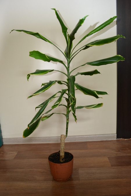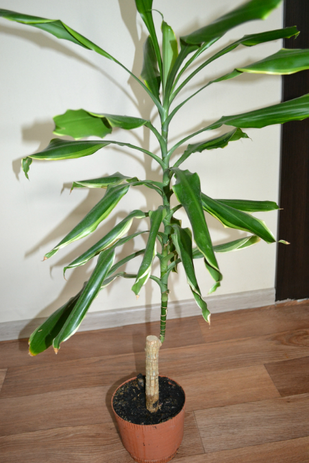 Драцена. Если не ошибаюсь у вас с лева почка пробивается? если так то можно подождать когда вылезет, симпотичнее будет смотреться. Еще можно попробовать укоренить веточку, но ствол не выбрасывайте из него еще должны прорезаться веточки, если на стволе есть бугорки, попробуйте помазать их гормональной пастой.