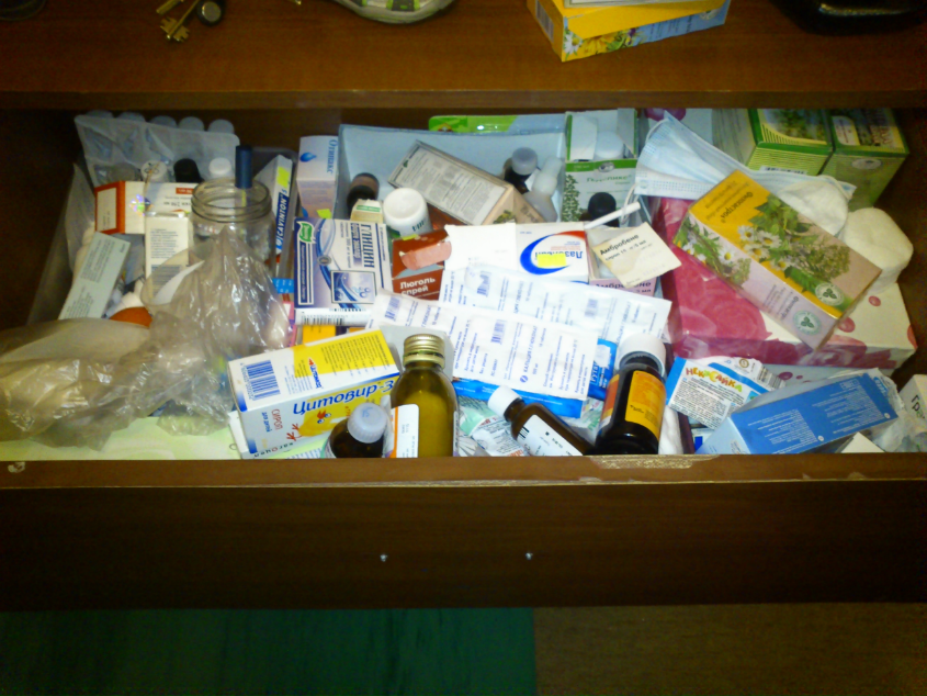 У меня в буфете 2 полочки, одна над другой. На одной - только детская аптечка. Вторая - общая +перевязочные средства, ватные палочки, влажные салфетки. В детской все лекарства в закрытой икейской коробочке с замочком. В нашей с одной стороны все пузырьки (то, что может само стоя стоять), в пластиковой сумочке на молнии (из-под подарочного набора с рыльно-мыльными флаконами) все "простынки" -бумажные и упаковки из фольги с таблетками. Во второй подобной сумочке - тюбики и мази. В третьей - перевязочные средства: пластыри, бинты, вата. Сами по себе там же стоят баночки с ватными палочками, упаковки с ватными дисками, влажные салфетки, градусник. Раз в полгода перебираю по срокам годности.