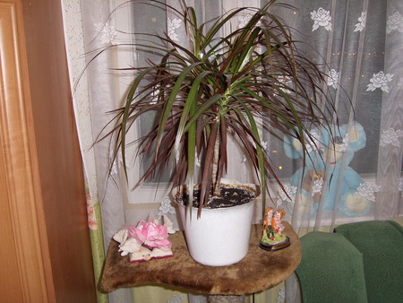 ага!!! здесь он еще приболевший, тут ему где-то год, а сейчас ему три или чуть больше! вообще у него должны листики быть вверху, но мне нравится когда они немного к низу тянутся!!! и вообще они солнца не любят, а у нас комната как раз на солнечной стороне и от солнца его ну ни как не спрятать...приходится ему терпеть!!!