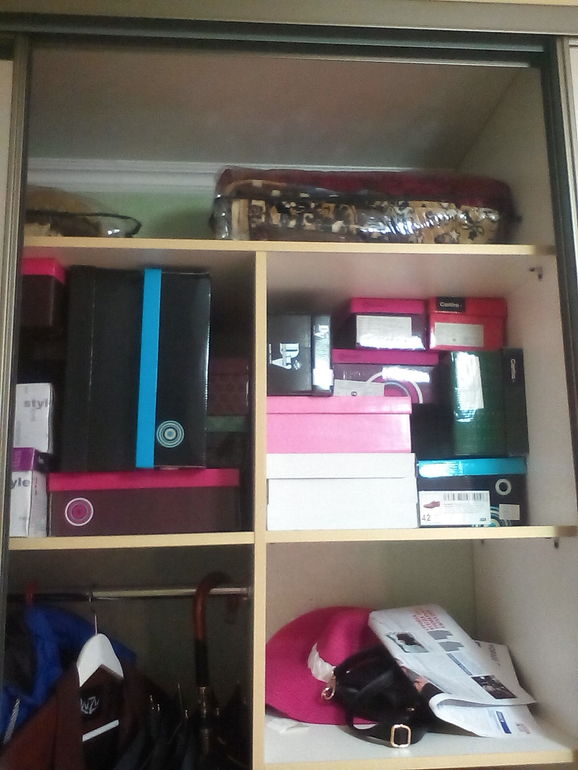 С одной стороны обклеить коробки бумагой под цвет шкафа или обоев в коридоре. Желательно маленькие коробки сложить в большие.