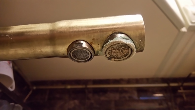 От фильтрованной воды тоже нет накипи в чайнике. Кстати, на хромированных кранах такого ужаса нет. Этот покрыт латунью, налет на медный купорос похож.