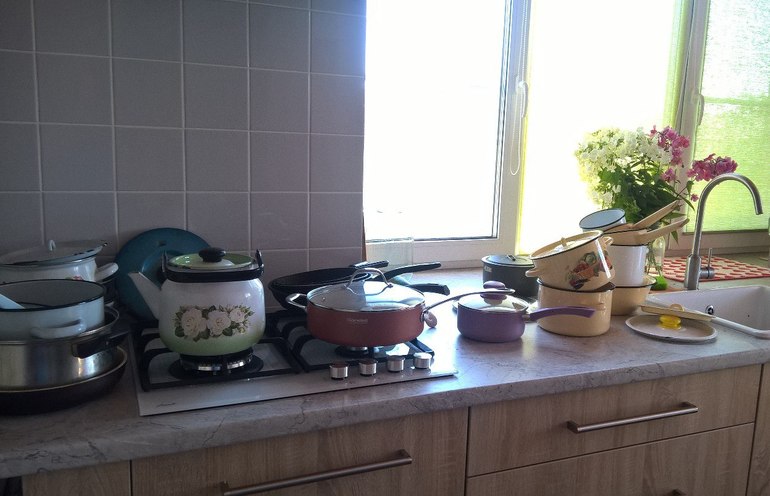 Я, в целом, не имею ничего против эмали. Она хорошо подходит и для варки, и для духовки, и её можно мыть в посудомойке. Но у нас её слишком много, я бы это количество сократила втрое, хотя понимаю, что меня ждет великая битва с мамой.