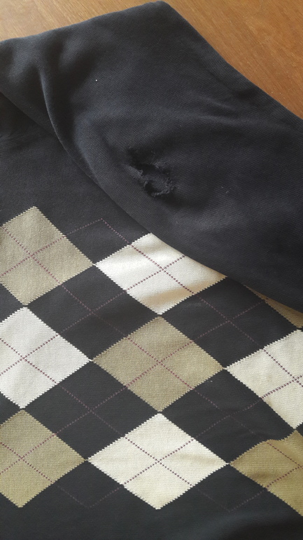 У рубашки теперь просто короткий рукав, а вот трикотажный джемпер хотела починить, сделав модные (а они еще в моде?) заплатки из контрастной ткани на локтях (свитер синий с ромбами, подойдет ли что-то в цвет рисунка и как правильно пришивать: обметочным, зигзагом? Что не стыдно было выйти погулять с детьми.