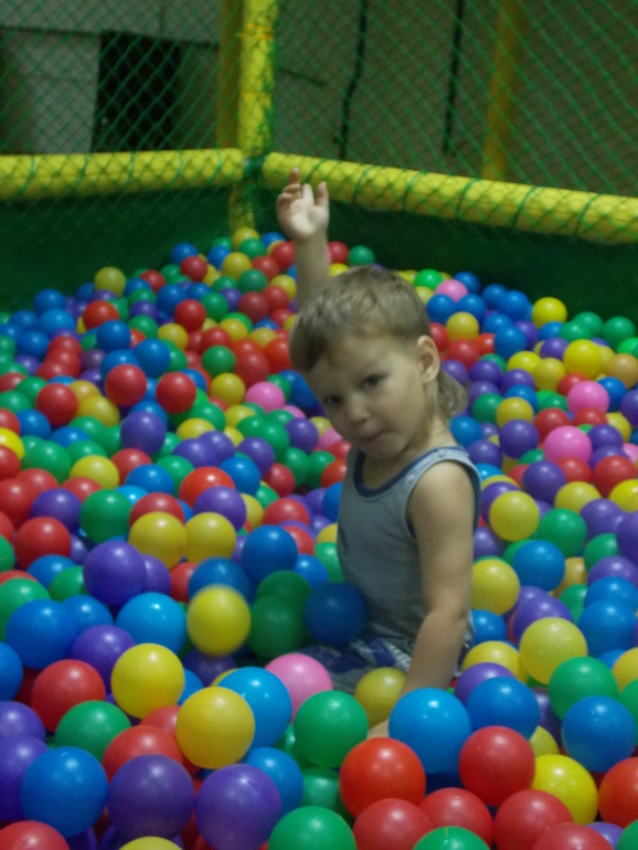 Рассказывать особо нечего - развлечения там стандартные. Интересно мне вот что - ребенку стало меня мало. Мы пришли, когда на площадке не было ни одной живой души. Еще месяц назад от таких просторов у него бы выросли крылья и он бы носился, лазил, кувыркался и хохотал вместе со мной. А тут загрустил. Сначала-то ему очень понравилось - место новое, неизведанное. А потом загрустил - маме на верх лазить нельзя, в шарики нельзя, на иго-го нельзя, а одному скучно... Растет - деток ему подавай.