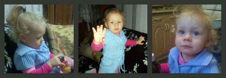 Игры: очень любит напольную мозаику, кукольную посудку. Любой предмет подносит к уху и говорит: «Да, алё!» Полюбила куклу Машу из м/ф «Маша и медведь».