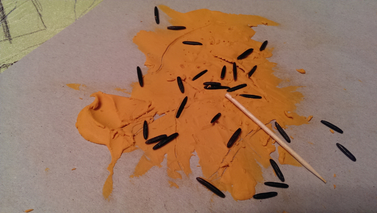 Тут пластилин размазывали, рисовали зубочисткой, приклеивали рисинки. Лера была в восторге и довольно долго для нее просидела за этим занятием.