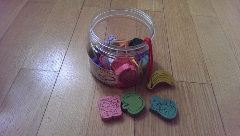 13. Эту шнуровку дали мес в 8-9. Сейчас она тоже свободно нанизывает бусины. Важно - их нельзя проглотить, на мой взгляд!