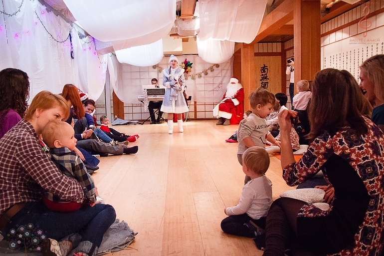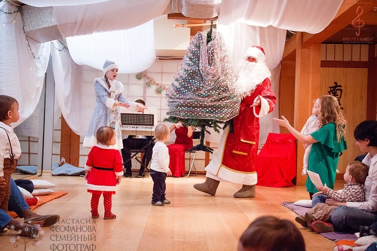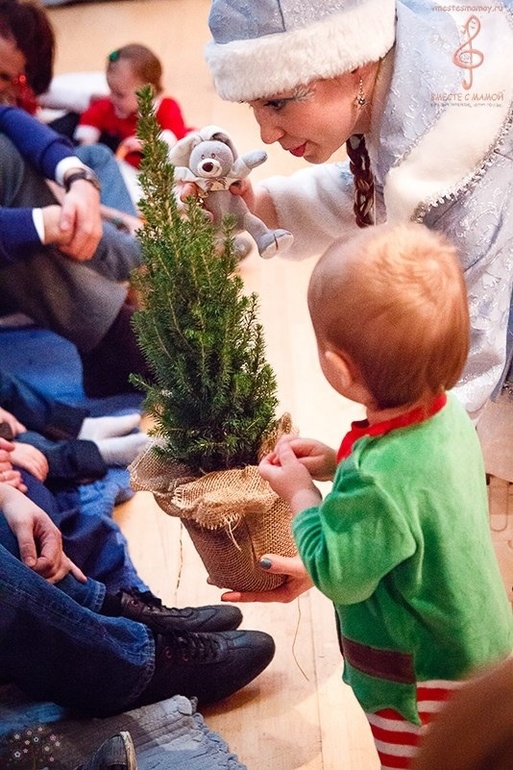 На елке было около 15 деток с мамами и кто-то с папами. Действие происходит в зале, мамы и папы садяться по кругу на пледики с подушечками и пытаются акцентрировать внимание своих деток на мини представлении. Представление не замысловатое, что хорошо, детки старше 1,5 слушали внимательно и следили за ходом действия и пытались повторить движения что показывала снегурочка. Снегурочка очень обаятельная девушка- ведущая праздника. Детки кидали снег( мишуру) , трогали елочку (настоящий можжевельник в горшке), танцевали хоровод( кто постарше) и конечно наряжали елочку... Мой ребенок был заинтересован минут 20, дальше бегал и делал что хотел... Я даже и не пыталась сконцентрировать внимание, ему и так было весело. Фото с дедом морозом у нас нет, он заплакал ( как и многие другие) . Понравилось и организация и атмосфера. Не надо было думать о фотографиях, так как у них свой фотограф, который через 2 дня просто выкладывает фотографии в соцсетях, от куда их и забираешь. Еще один плюс это живая музыка, скрипка сына заворожила... Правда не надолго))