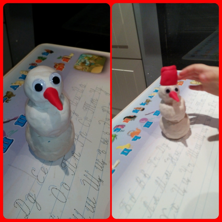 Моя куколка сразу сняла со снеговика ведоро, глазки и нос и стала сама их клеить.