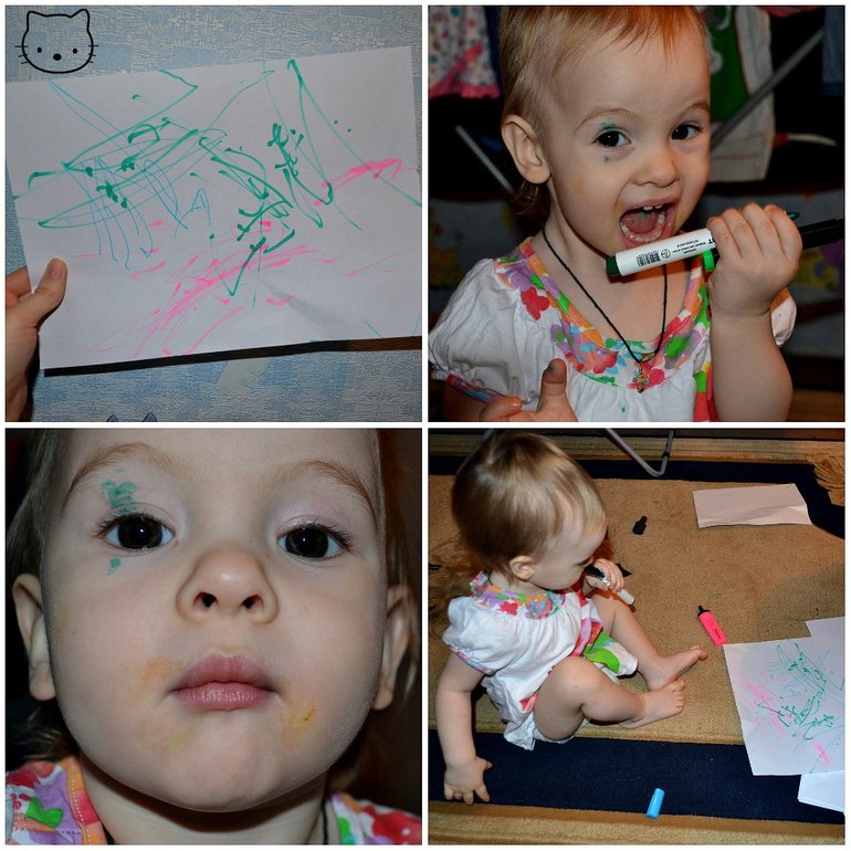 достала бумагу, фломастеры...в общем, ей понравилось! перекладывает из руки в руку фломастер, рисует то одной рукой, то другой. старается)) точки, дуги, каля-маля)))