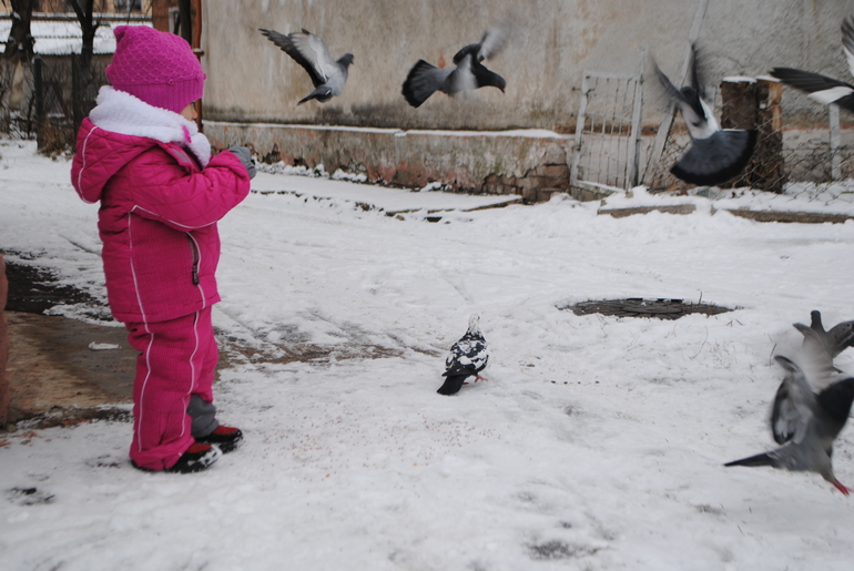 Гулять стараемся ходить каждый день,ну основное наше задание это голубей покормить,она выходит и начинает их звать-вур-вур!)Покормит и давай искать чем же себя занять!!