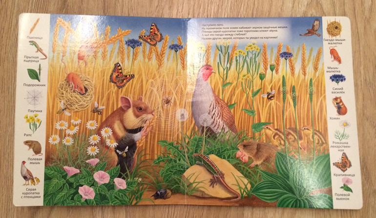Это серия «Первые книги малыша». Я пока что купила только 2 из них (На лугу и в поле и Семья и дом), потому что они постоянно пропадают с продажи и их нужно отлавливать. Но стоимость (100-150 руб. за книгу) очень привлекает! Книги представляют собой так называемые «виммельбухи» с парочкой абзацев текста на каждом развороте. По краям разворота нарисованы и подписаны отдельные предметы - таким образом с детьми постарше (наверно после 2х лет) можно играть в поиски предметов.