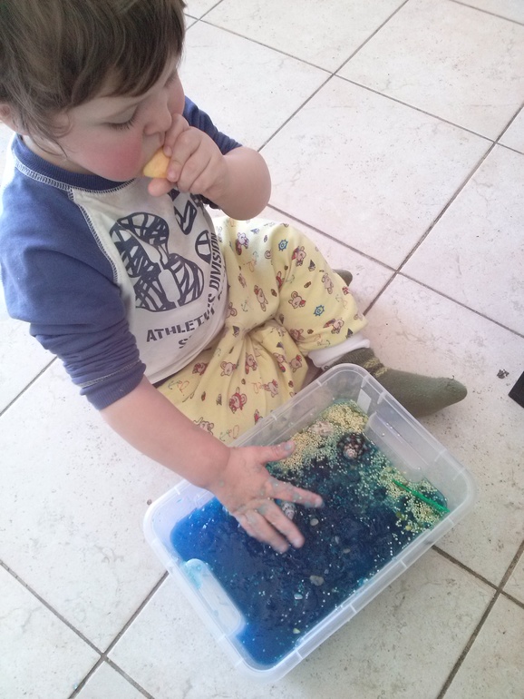 Активности нам не занимать. Я называю его шнырь. Ибо он везде! Стал залазить на полки, подоконники, обеденный стол. Стоит на секунду отвлечься, Андрей уже куда-нибудь залез. Недавно залез на корзину для белья, крышка под ним провалилась и я узрела только ноги, торчащие из корзины. Кушать при Андрюше ничего нельзя, сразу начинает штурмовать обеденный стол. Без добычи не уйдет! Делали, точнее пытались делать развивающую игру "океан" из желе. Получилось что-то непонятное(((