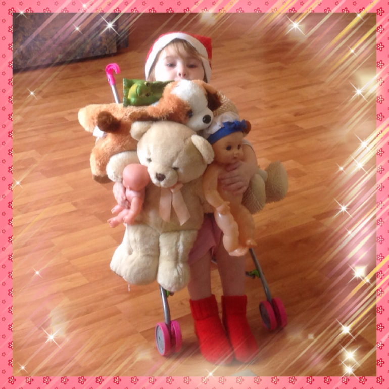Усадил Киру на маленькую коляску для кукол и дал ей в руки гору игрушек. И так катал по комнате