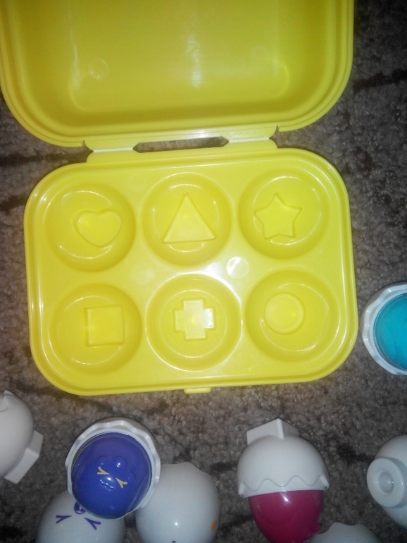 3.«Пищащая компания» - детский сортер от компании Tomy .От них мы в восторге,можно разбирать,собирать,вставлять в ячейки,а самое главное просто не так вставишь надо выбрать правильно в какую ячейку,на дне у каждого яичка своя фигура.Также можно изучать цвета,а также каждое яичко закрывается только своей скорлупкой,там нарисованы личика и обозначен цвет как внутри самого яйца.А еще они пищат когда на них нажимаешь.Мы пока разбираем,собираем(естественно не по цветам пока),нажимаем чтобы пищали,и пытаеться поставить в лоток,но пока не в свои ячейки