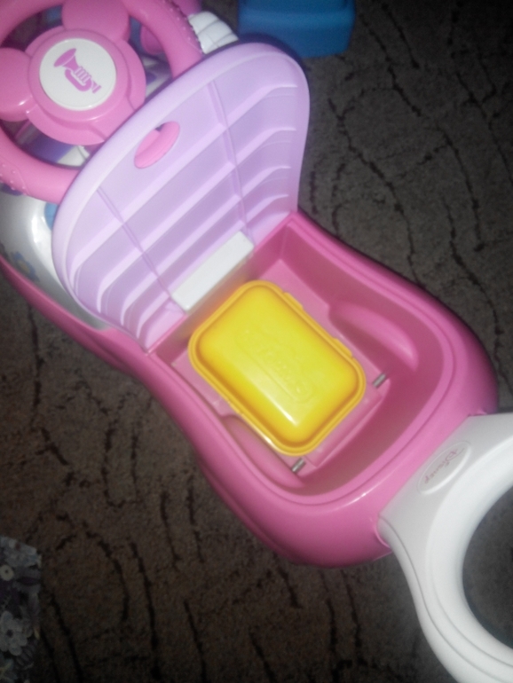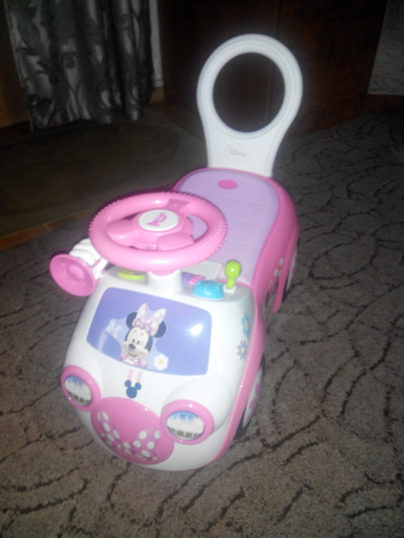 2. Kiddieland Минни Маус машинка толокар.Садимся,нажимаем на все кнопочки,нравится самой катать,внутри багажник.колеса не очень хорошо поворачиваются,сама неможет оттолкнутся не хватает роста