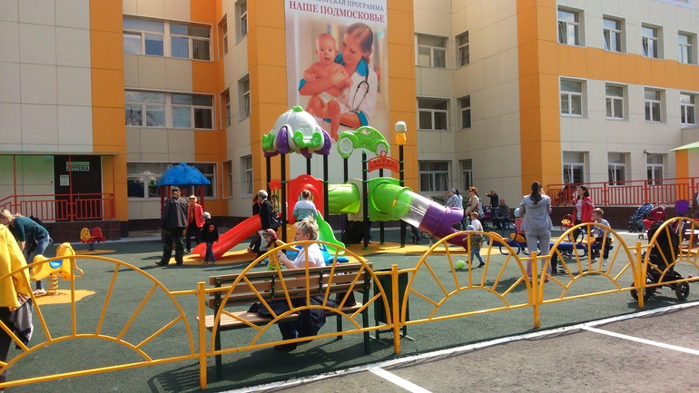 У нас поликлинника мало того, что за городом, а о площадке нам только мечтать))