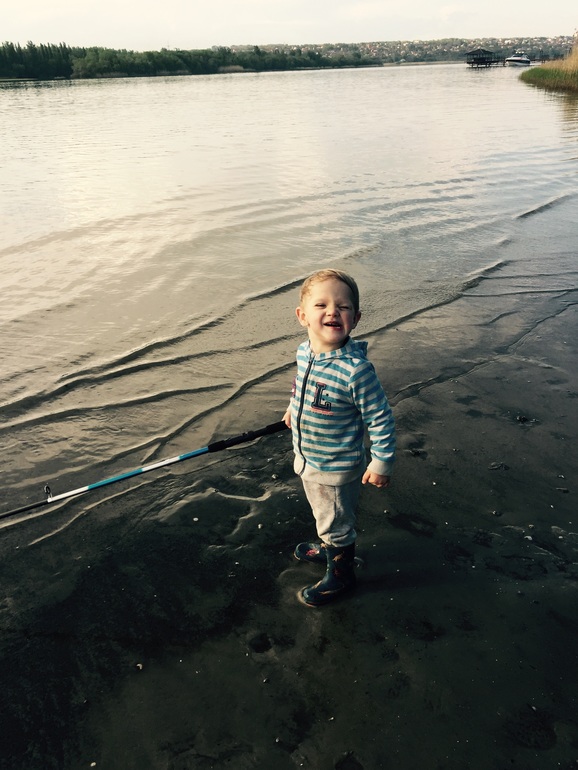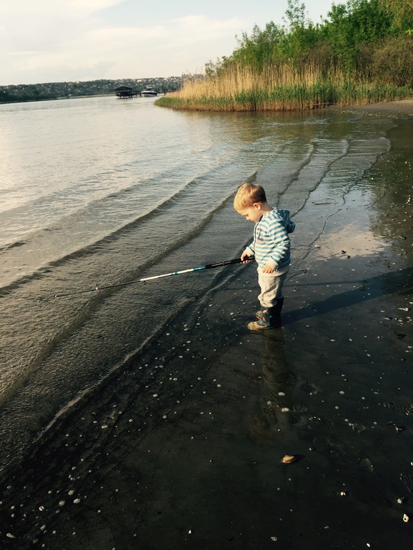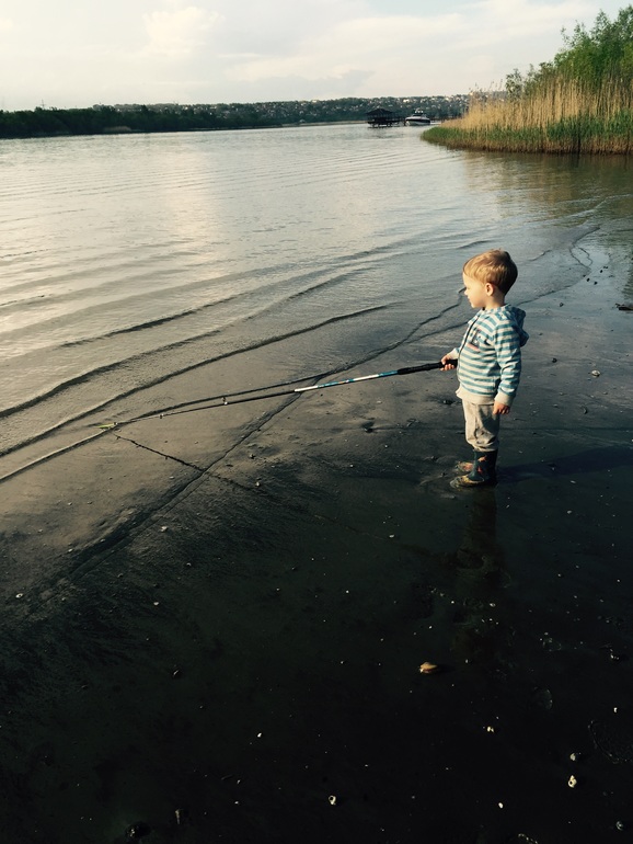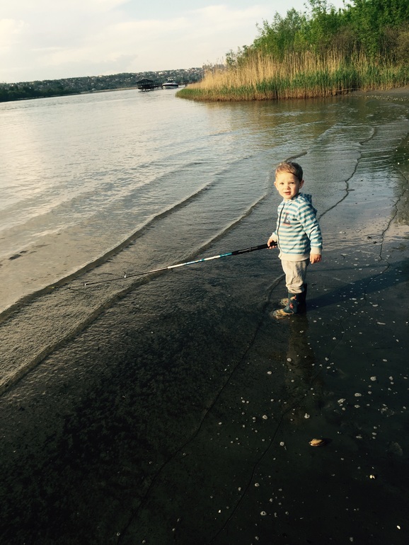 Ой, ну довольный!!!! Здорово, вода рядом, хорошее дело рыбалка! Пусть учится
