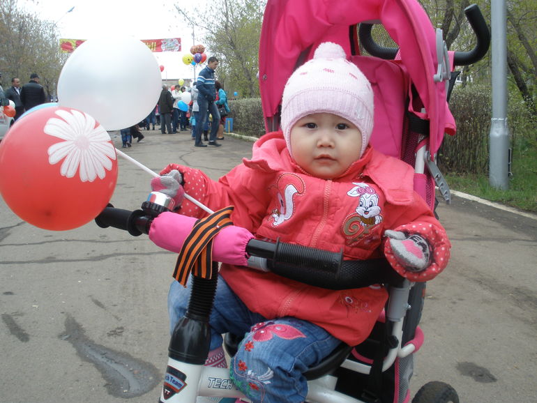 Би-би(ну это машина), а в последнее время и на свой велосипед, на котором стали ездить примерно месяц назад.