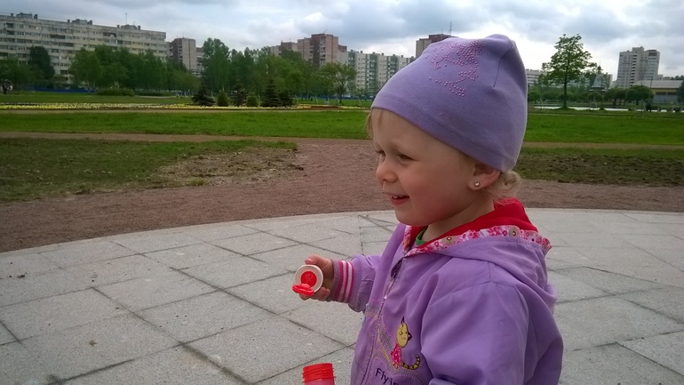 На прогулках Алиска очень активна, сразу бежит к детям. Всем встречным обязательно машет ручкой "привет!", а уходя, говорит: "Пока!" Причем, не только людям, но и горкам, качелям, площадке...)))