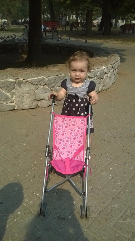 Очень любит укачивать кукол и петь "Ааа". Все думала нужно ли покупать детскую коляску и тут позавчера пришли на площадку и попросили покатать, она будто всю жизнь ее катала, еле оторвала, Однозначно надо покупать. Такая милая у меня маленькая мамочка