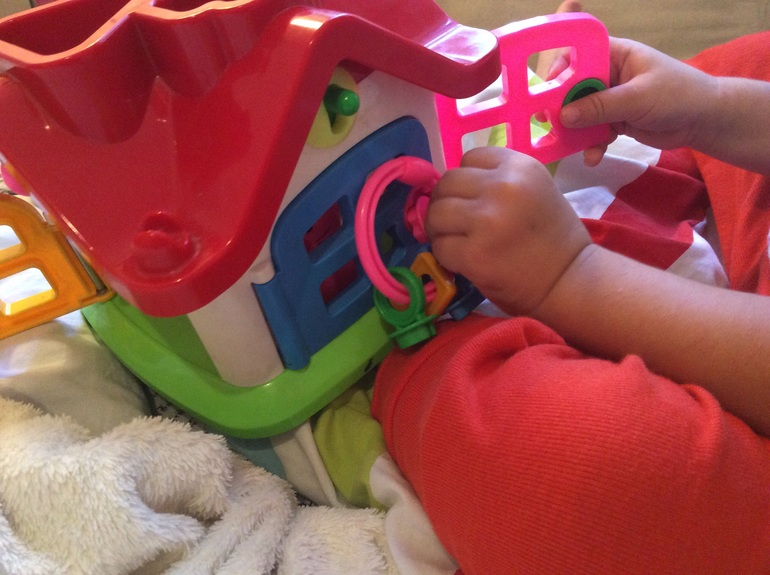 Нам на годик подарили подобный домик с ручкой сверху,очень его любит, вот уже почти месяц таскает как ридикюль)))) по назначению пользоваться не умеет, только робкие попытки пристроить фигурки в сортер