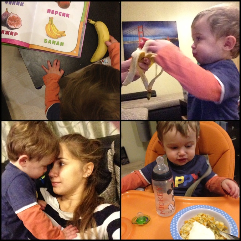 После прогулки папа наш уехал халтурить, а мы с Максом тусили дома.Увидел на картинке банан и потребовал настоящий))) Потом обнимашки...ммм... Затем ужин( плов ).