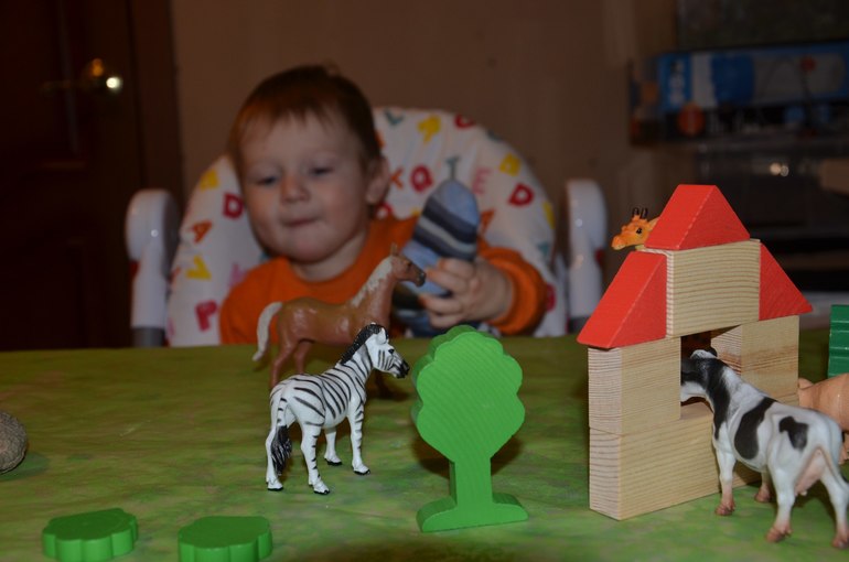 - "ходит" игрушками животных (очень часто в них играем, знает - корову, жирафа, козу и лошадь и вроде как слона))
