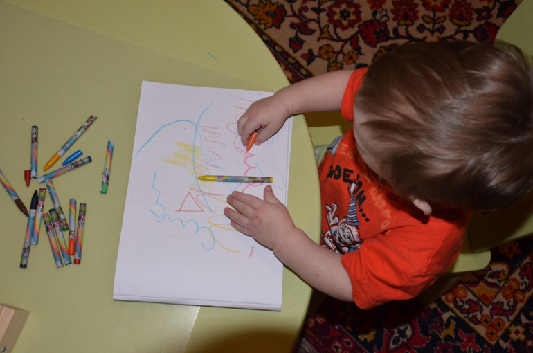 Проявил интерес к рисованию, рисует калякали и показывает мне, просит меня нарисовать что-нибудь. Пока рисуем только простым карандашом и восковыми мелками. В ближайшем будущем все же дам ему краску)
