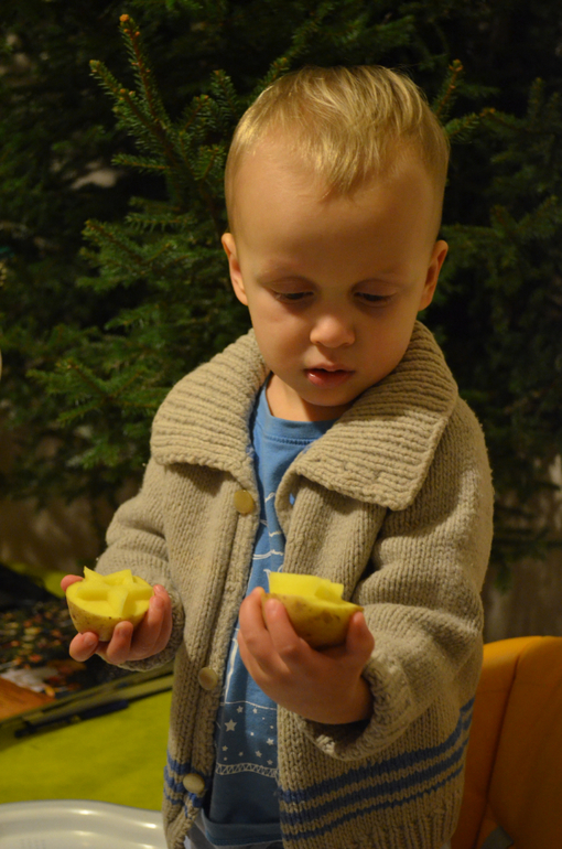 Я подготовила печатки - вырезала ёлку и звезду на половинках картофелины, смешала синюю и белую краски, расстелила рулон икеевской бумаги и...Дима уже в нетерпении крутился в стульчике и рассматривал печатки.