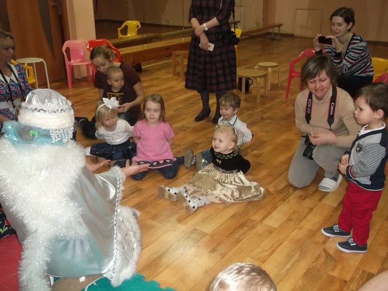 Нас запустили в зал, елка,небольшие декорации, скромно, зал от йога студии. Представление вела зимушка-зима, Вере она очень понравилась.