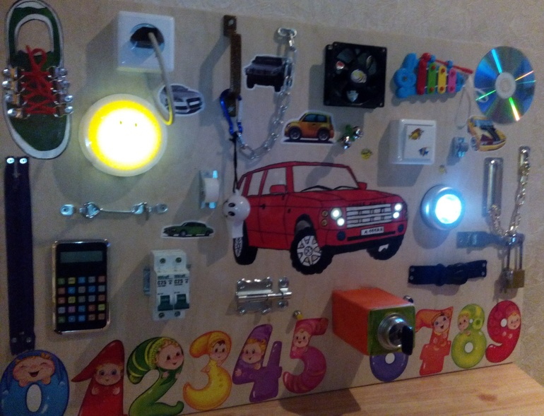 Девочки, привет! Покажу вам нашу новую досочку для мальчика почти 2 лет. В чем ее особенность? На этой доске расположен настоящий замок зажигания! При повороте ключа загораются фары, а если повернуть ключ на вторую позицию - включится кулер! На машине горят все фары- 3 пары- белые, синие и жёлтые. Все остальное вроде видно) Если есть вопросы, с удовольствием отвечу! Кому интересны наши работы, буду рада видеть в инстаграмм( там можно посмотреть видеообзор). Адекватная критика приветствуется!) И ещё, купили бы вы такую досочку своему ребёнку и если да, то за сколько?) Всем добра!)