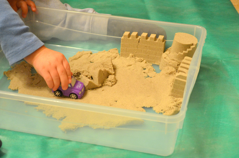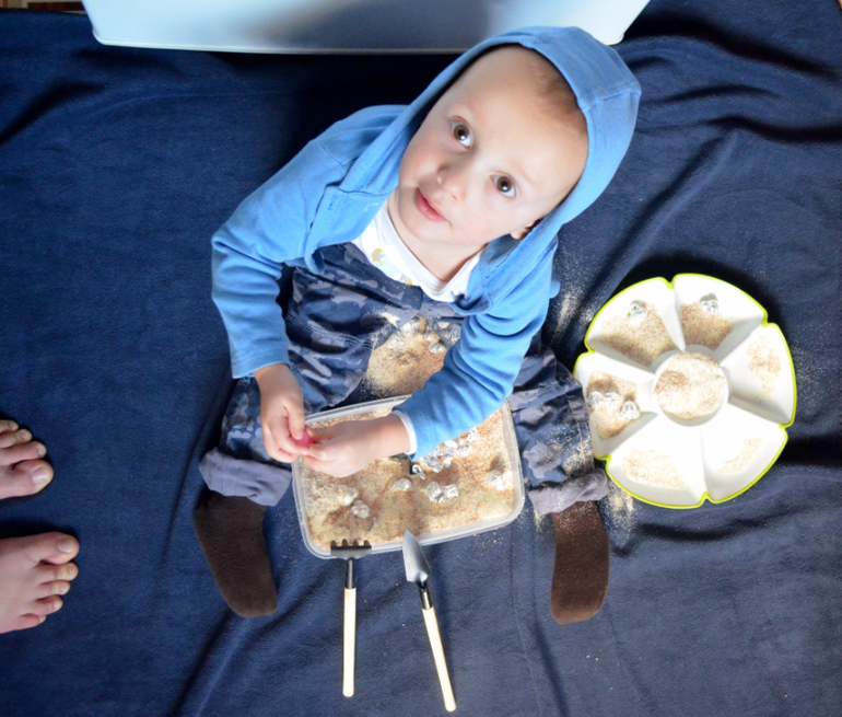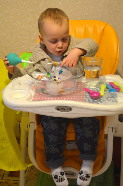 Но бывали игры и долгие. Например, с раскрашенным рисом, гидрогелем, с фигурками во льду, опыты с содой, раскрашивание семьи картонных жирафиков, и, наконец, поиски сокровищ в манке и отрубях.