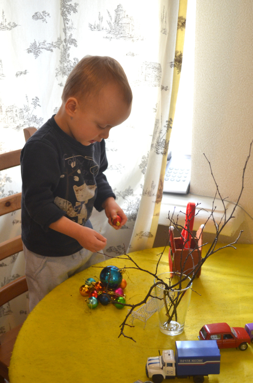Сегодня утром Дима при минимальном моём участии разбил самый настоящий весенний парк на столе))) А началось все с того, что мне надо было помыть посуду, а малыш увидел где-то наверху, среди моих складов, ветки.