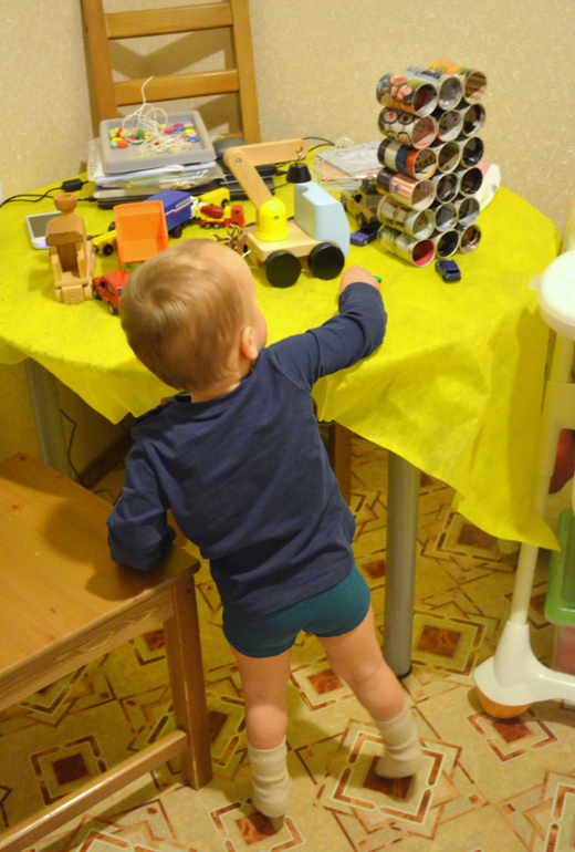 Чаще всего на данный момент димины игры проходят на обеденном столе. Он пока хочет играть рядом с нами, а заняты мы чаще всего на кухне. Самостоятельные игры как раз и начались в период моей внезапной загруженности домашними делами.