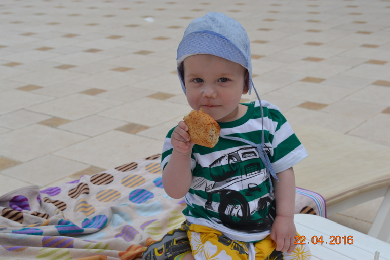 Мы выбрали классный отель! Большая территория, первая линия, крытый бассейн, прекрасное питание. Для Илья я брала только коробочную кашу на всякий случай, фруктовые пюре в паучах на экскурсии и в дорогу и злаковые батончики Гербер. Мы кормили его той едой, которую давали в отеле. Естественно, заранее я читала отзывы и готовилась, что мне будет чем кормить ребенка. Ну и перед поездкой на всякий пропили курс аллергии нет, проверено давно). С кашами на завтраках было туго, так что эту коробку Илья и съел. Сын очень полюбил местный хлеб! Правда, очень вкусный. И слоеные круассаны, которые пекли к завтраку.