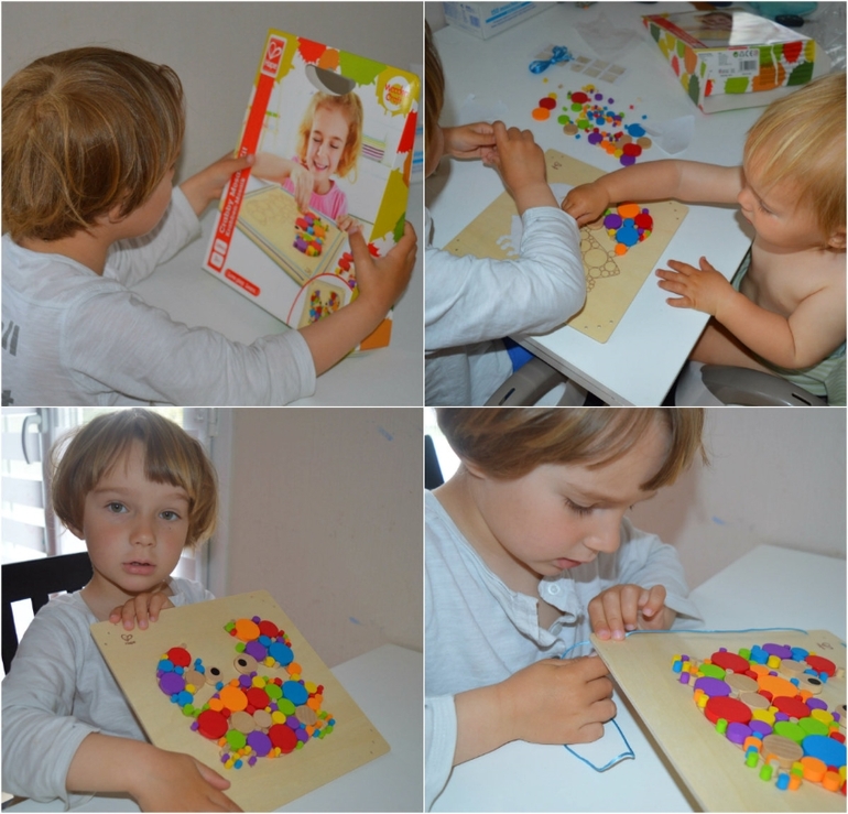 На деревянной рамочке, на клейкой основе нарисованы кружочки разных размеров, на которые надо клеить разноцветные деревянные кружки, соответствующие по размеру, чтобы получилась вот такая мозаика. Бонус к полезности, мелкой моторике и прочему - прилагается еще две тесемки и из них по простой схеме надо сделать рамку-шнуровку. Антуан справился сам, я только указала, куда вставлять по схеме. Вот, висит, Антуан всем гостям рассказывает, гордится, что сам все сделал, а Лиза бьет себя в грудь и кричит: "И я! и я!"