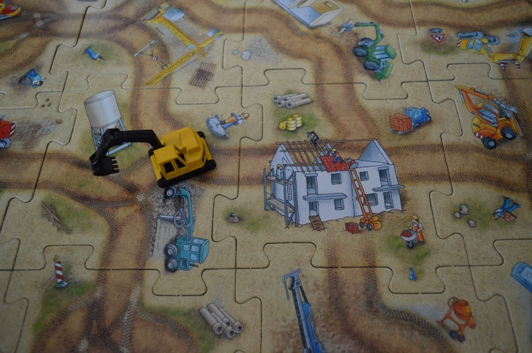 Это (относительно) гигантский паззл от SIKU на тему стройплощадки + две рабочие машинки неплохого качества (у этой фирмы огромное множество машинок, хорошие, я думаю дозаказать еще пару потом по каталогу, который прилагался к игре). Паззл не настоящий паззл, в том смысле, что его можно собрать в произвольном порядке, любая деталь вставляется в любую другую, и при том дороги всегда куда-то ведут! Не прерываются! Там целый строймир - кучи цементы, трубы, и прочие прекрасные вещи изображены: