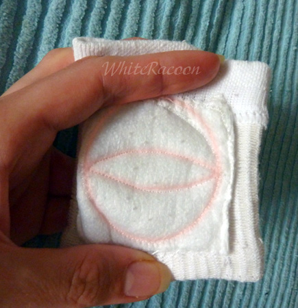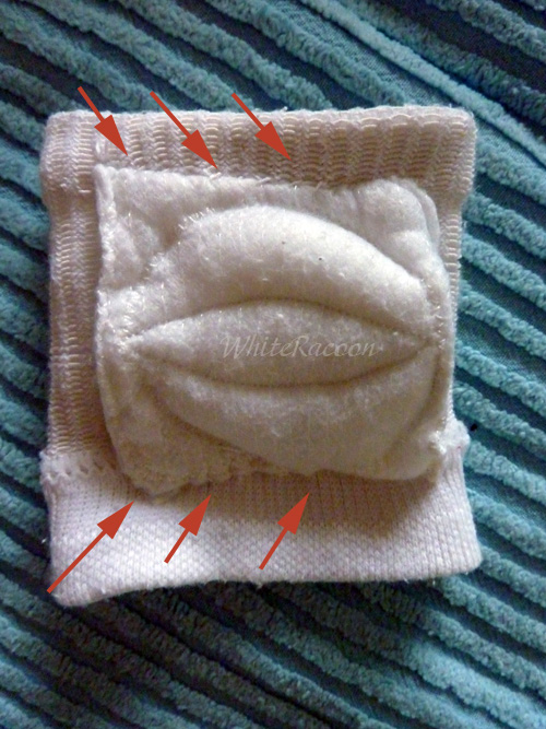 4. Внутрь кладём синтепон или вату - амортизатор. И сшиваем квадратики-конвертики. Для фиксации наполнителя простёгиваем квадраты: вписываем круг и делим его на три дольки (см фото выше). Много там шить не надо, меньше швов - целей колени.
