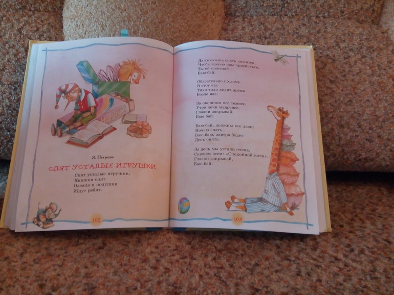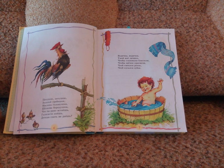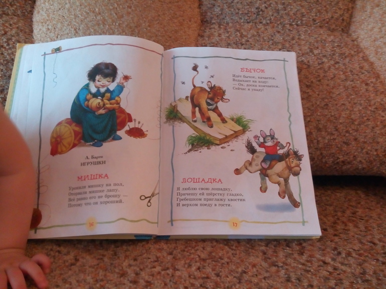 Книга содержит разделы: Потешки, Стихи, Колыбельные и Сказки. Что-то дочке нравится, читаем но не все, даже половины не читаем. Оно и понятно. Ведь ребенку помимо чтения интересен и сам выбор книги, сходить за ней, выбрать, принести, усесться поудобней (дочка очень долго усаживается перед чтением поудобней!). А читать полчаса-40 минут одну книгу, никуда не вставая, ни на что не переключаясь - наверное скучновато все же, по крайне мере для возраста 1,5 лет.