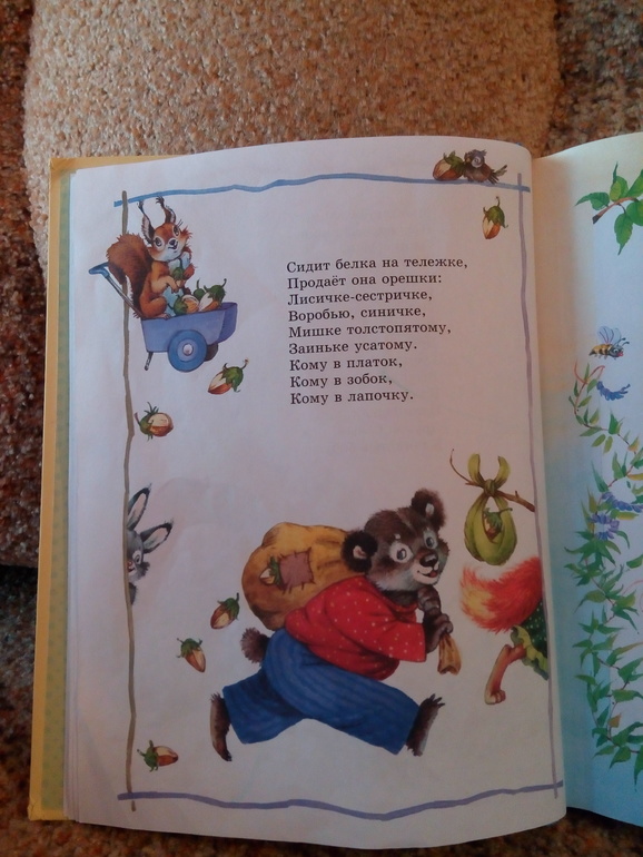 Белка раздает орешки мишке, зайке, лисичке. С мишкой проблем нет. Но неужели трудно было уместить на странице зайку целиком, а не его пол морды и лисицу, а не ее кусок хвоста и 1 лапу? Ну в общем, не читаю даже этот стих дочке. Она любит чтоб всех героев показывала ей, а здесь и смотреть не на кого.