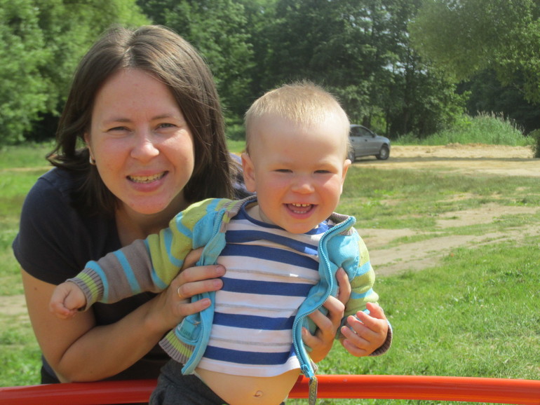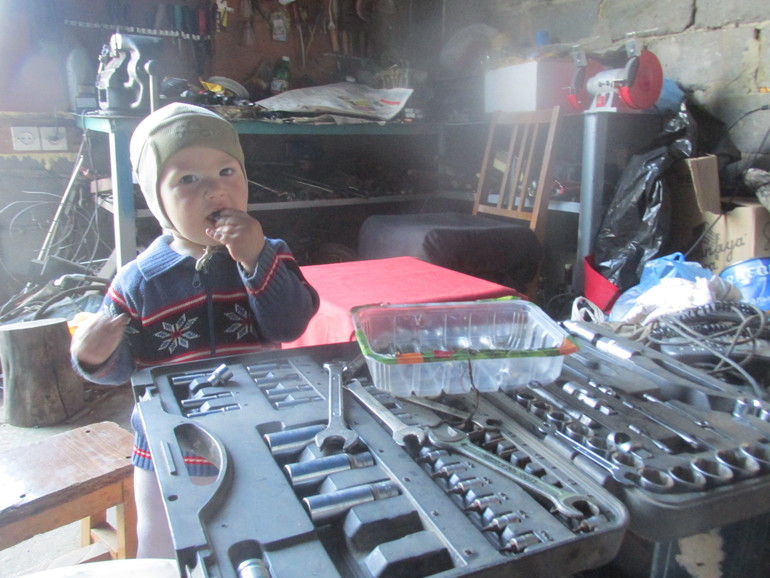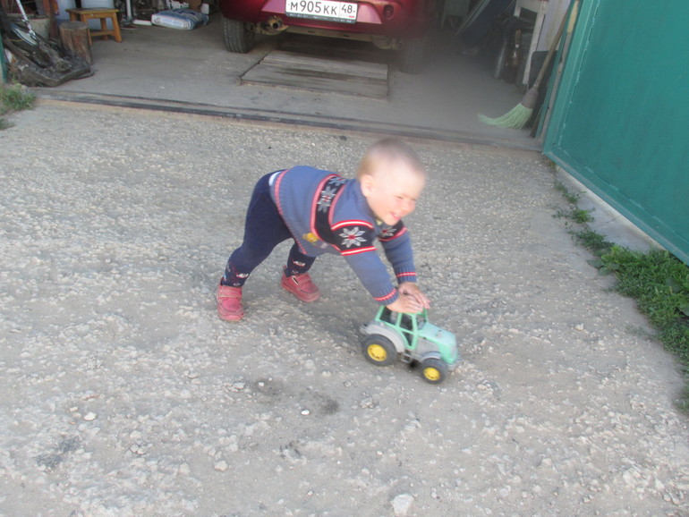 Утром просыпаемся часов в 7, в последнее время стали просыпаться и ложиться позже, встаем уже ближе к 8. Завтракаем, Макс сразу идет к двери, требует гулять. Мне обычно удается его немного задержать дома, пока я делаю домашние дела, он бродит по дома, чем-то играет. Если капризничает, сразу идем на улицу. На улице он любит катать свой трактор по дороге, или каталку-уточку, кидать мячик. Иногда сидит в песке, но реже, чем раньше. Бродит по двору, у нас места много, перед домом пройдемся, сзади дома, к бабушке зайдем, на огород, кролика покормим, собачку погладим, киску найдем, в гараж зайдем... Еще любит чтобы его катали на самокате или на машинке.