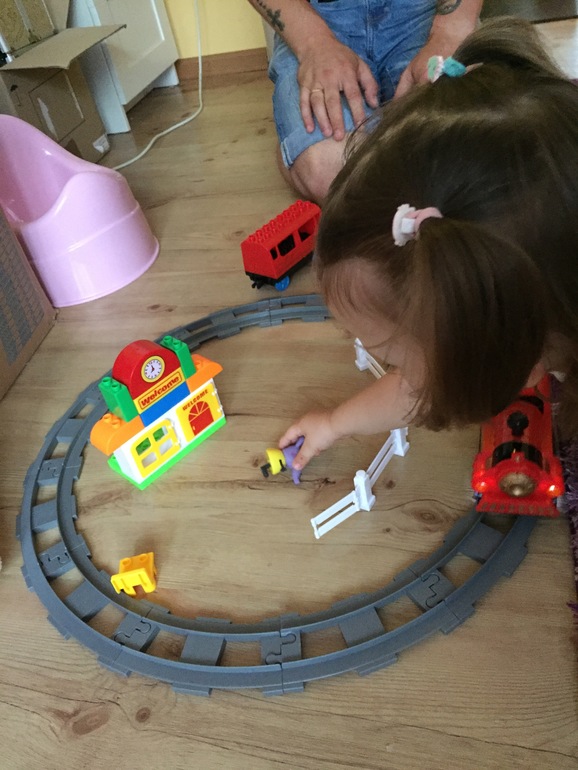 я не знаю аналог или нет, просто она увидела в магазине и купили)) Качество мне нравится, добротное все такое) Паровозик со свето-звуко эффектами, в наборе все герои пеппы) с лего дупло не пробовала еще стыкуется или нет)