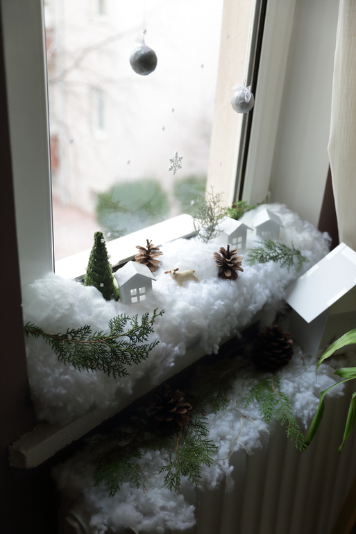 У нас-то снега нет. Только раз пролетал, но я успела показать Джаню. К Новому году не особо готовимся, у меня много причин на это ) Но без зимнего настроения - никак! ) Украсили окошко! Представляю как соседи из дома напротив любят смотреть вечером на фонарики-свечки, которые днём мы не включаем )