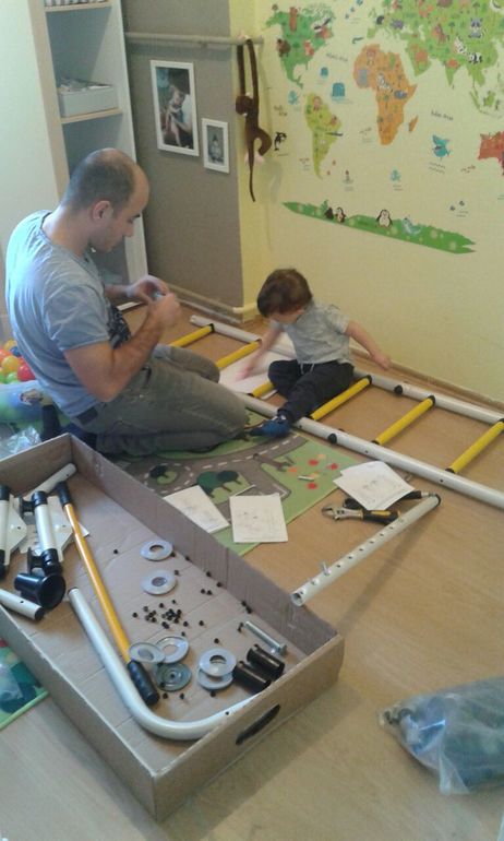 Наконец-то, собрали спортивный комплекс! Хотя нужно привинтить ещё перекладину и повесить кольца. Трапеция и верёвочная лестница пока остались в Екатеринбурге.