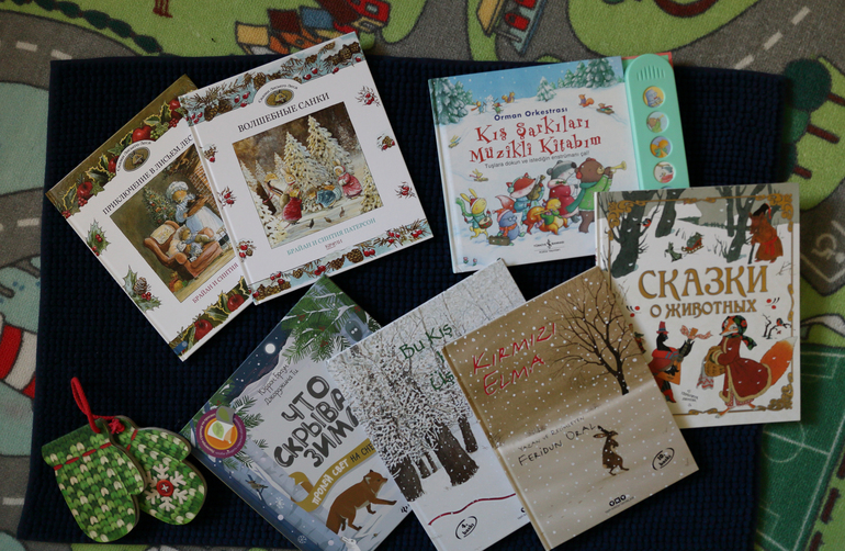 Так вот, с зимой у нас напряг. У нас есть любимый книжный магазин. Мы с Джаню любим пропадать там часами. Там и игрушки, и книжки, и всё можно посмотреть почитать потрогать, с ним ещё продавцы любят играть, чтобы я смогла спокойно навыбирать книг и оставить кучу денег, конечно ) Но у нас такие походы раз в месяц обычно. К сожалению, зимних книг почти нет. Вот прям совсем. Таких снежных, уютных, тёплых. Пару-тройку взяли и всё, остальные пара из России ещё летом привезла )