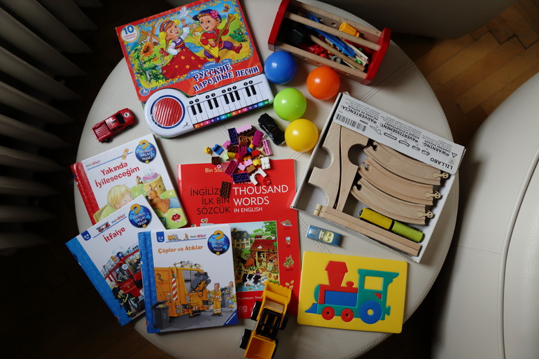 Самые любимые, пожалуй, книжка-пианино и железная дорога (которая очень даже деревянная). Книжка - обалденная! Нотки чистые, песенки все в народном исполнении, мне это особенно дорого, как человеку, у которого вся жизнь связана с фольклором ) и как человеку на чужбине. И всякие "Э-эээээх". Джанюш уже тоже подвизгивает ) Больше всего любит Каравай ) Обязательно всей семьёй ))) Или с танцами, или музыкальные инструменты нам выдаёт )) Нашли у папы в закромах губную гармошку и всё - любовь с первого взгляда! ))) И так здорово играет на ней!