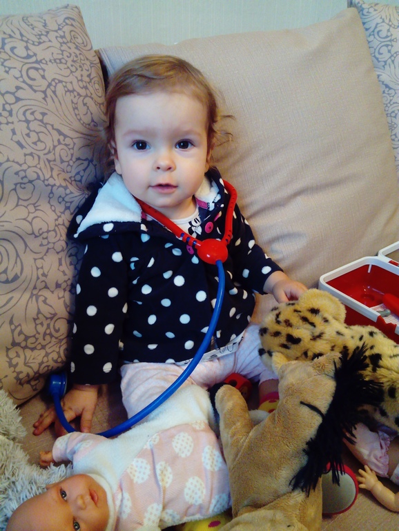 Дома любит играть в доктора. Со своим медицинским чемоданчиком бежит с утра и вечером (обходы врача)), Всех животных слушает, делает уколы и т.д. Любит кормить всех, рассаживает игрушки, куклы. С сортерами и пирамидками справляется уже очень быстро, прям раз-два и все собрано. :) С недавних пор стала не только разбирать, но и собирать лего дупло.