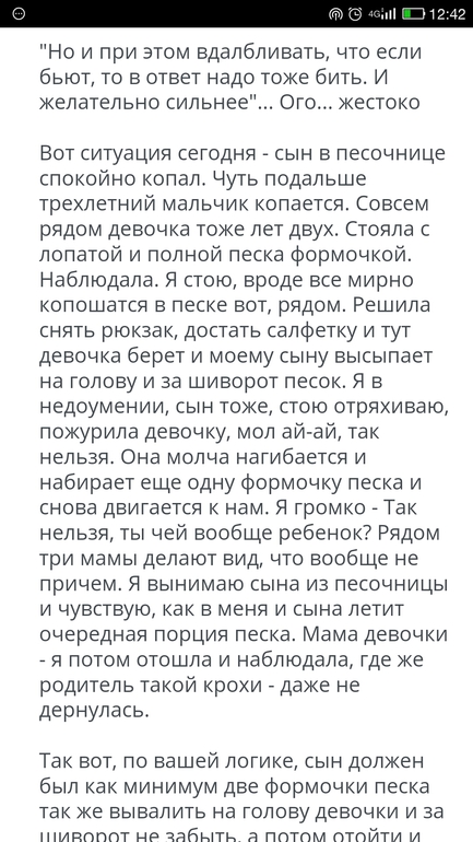 а сына учила. Он миролюбивый, ко всем детям с улыбкой, а его хрясть ни за что. А папа с улыбкой-моему ребенку так нравится бороться, он просто борется.. Так мило, борется в два года, наверное и все правила знает, и с моим договорился, что тот не против. В таком случае только сдача. Иначе не отстанет. И таких примеров море.
